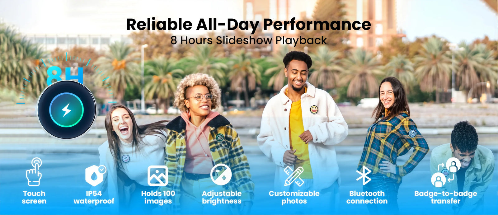 A: It’s incredibly easy. Just download our free app, connect the badge via Bluetooth, select any GIF, MP4, or image from your phone's gallery, and hit upload. Your digital canvas updates instantly.